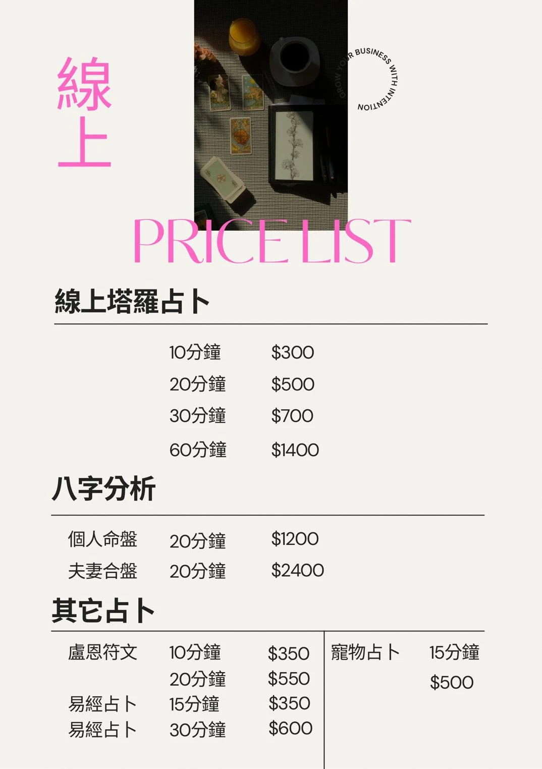 營業時間 週一公休 13:00-20:00(店面營業時間) 11:00-24:00(線上占卜)