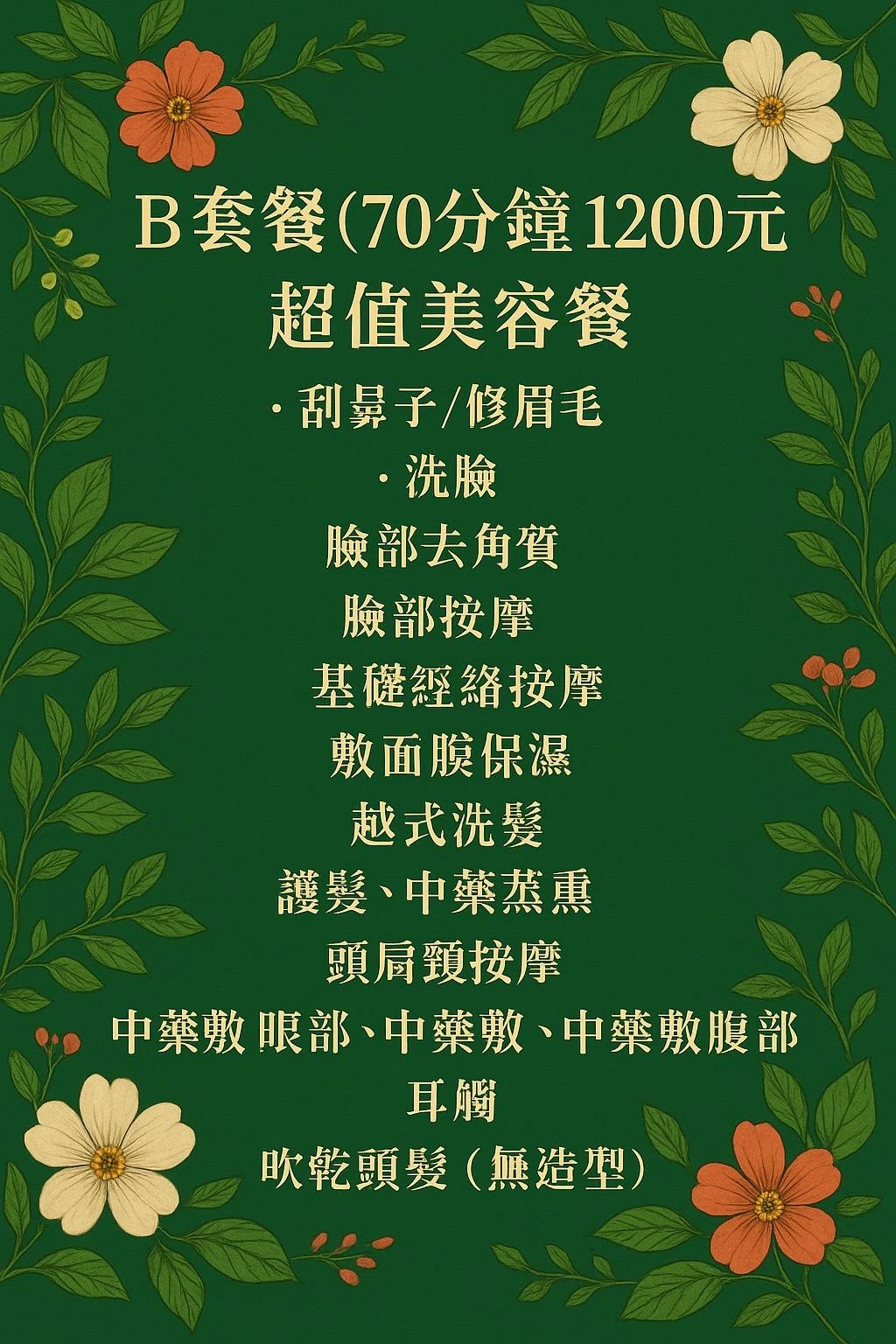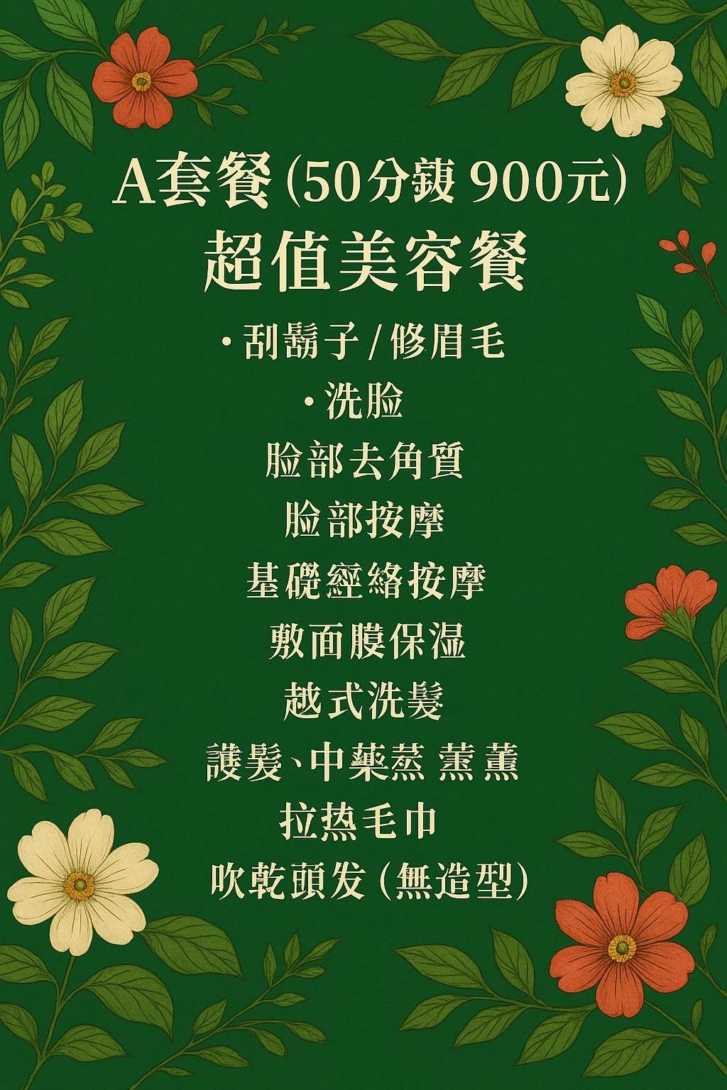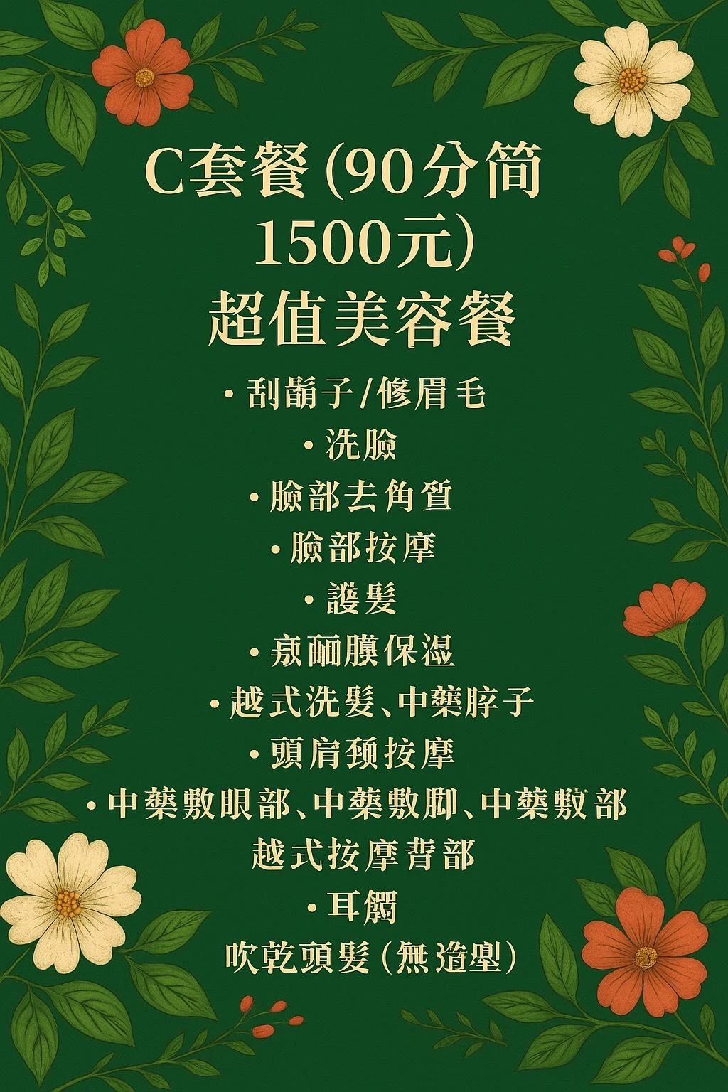 刮鬍子/修眉毛+洗臉+臉部去角質+臉部按摩+基礎經絡按摩+敷面膜保濕+越式洗髮+護髮、中藥蒸熏+頭肩頸按摩+中藥敷眼部、腹部+越式按摩背部+耳燭+吹乾頭髮(無造型)