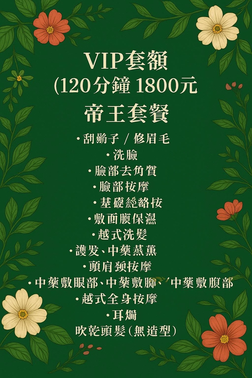 刮鬍子/修眉毛+洗臉+臉部去角質+臉部按摩+基礎經絡按摩+敷面膜保濕+越式洗髮+護髮、中藥蒸熏+頭肩頸按摩+中藥敷眼部、腹部+越式全身按摩+耳燭+吹乾頭髮(無造型)