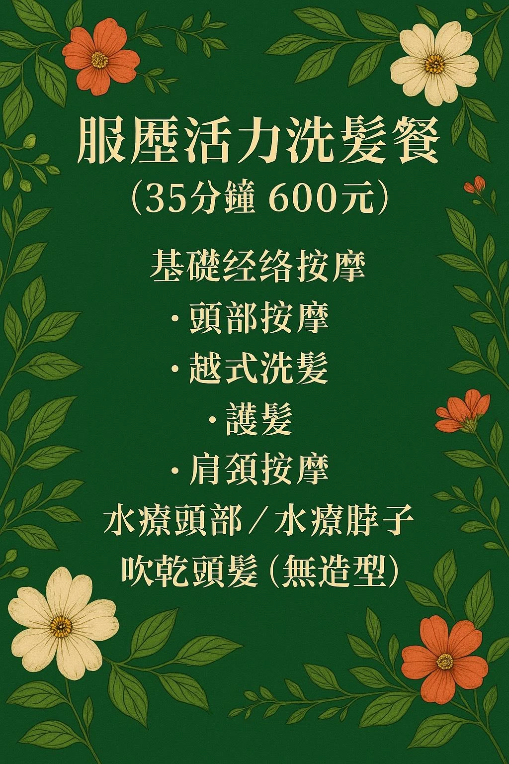 基礎經絡按摩+頭部按摩+越式洗髮+護髮+肩頸按摩+水療頭部/水療脖子+吹乾頭髮(無造型)